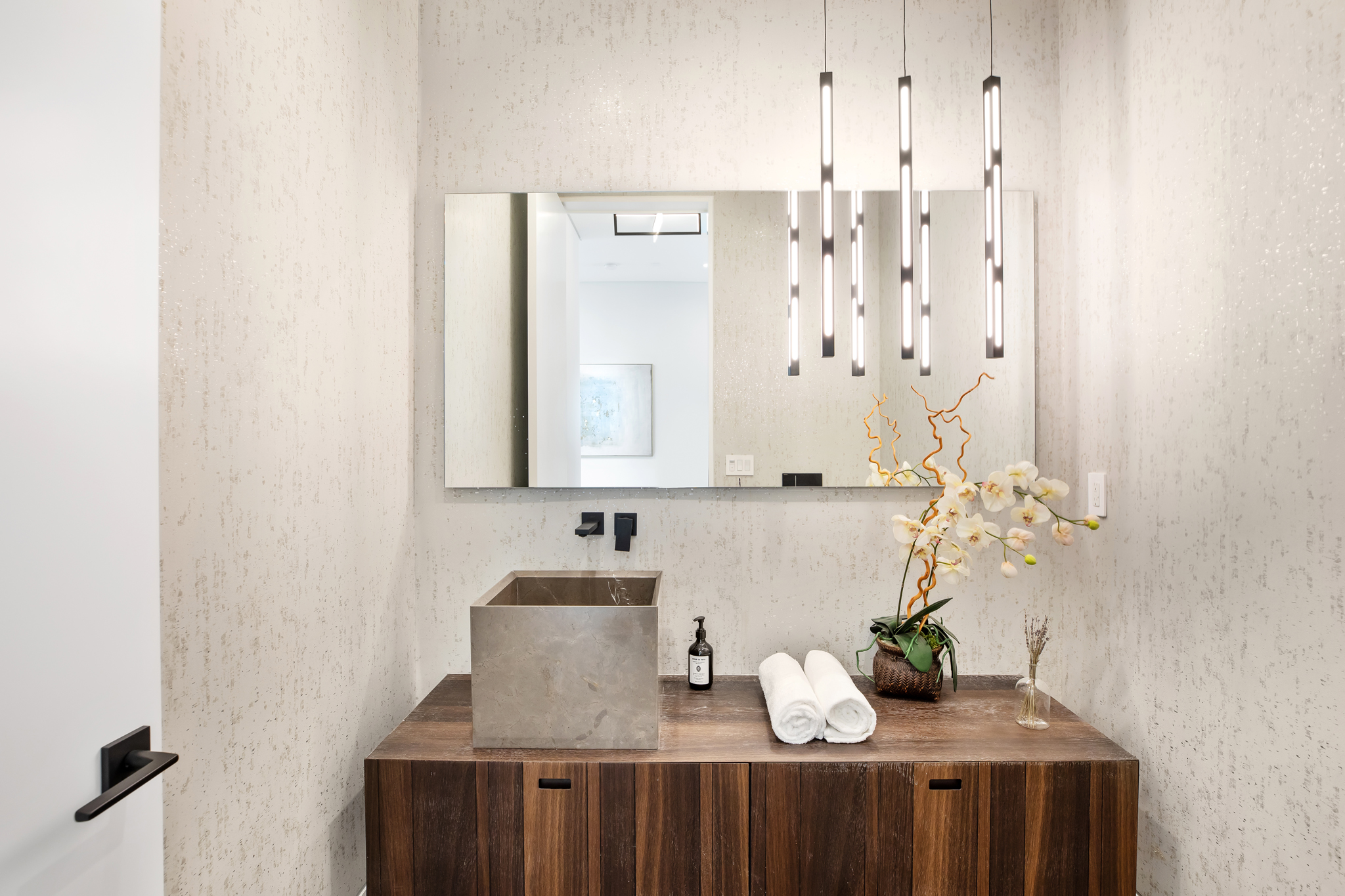 Layered lighting solutions including vanity lights, recessed fixtures, LED accents, and dimmable options that balance function and ambiance.